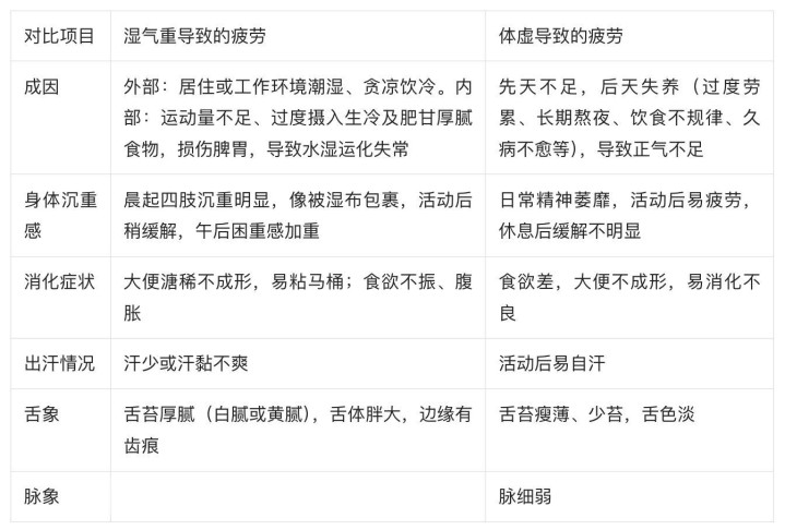 为了让人人更明晰地分辨潮湿重和体虚导致的疲困,咱们用表格景观进行对比: